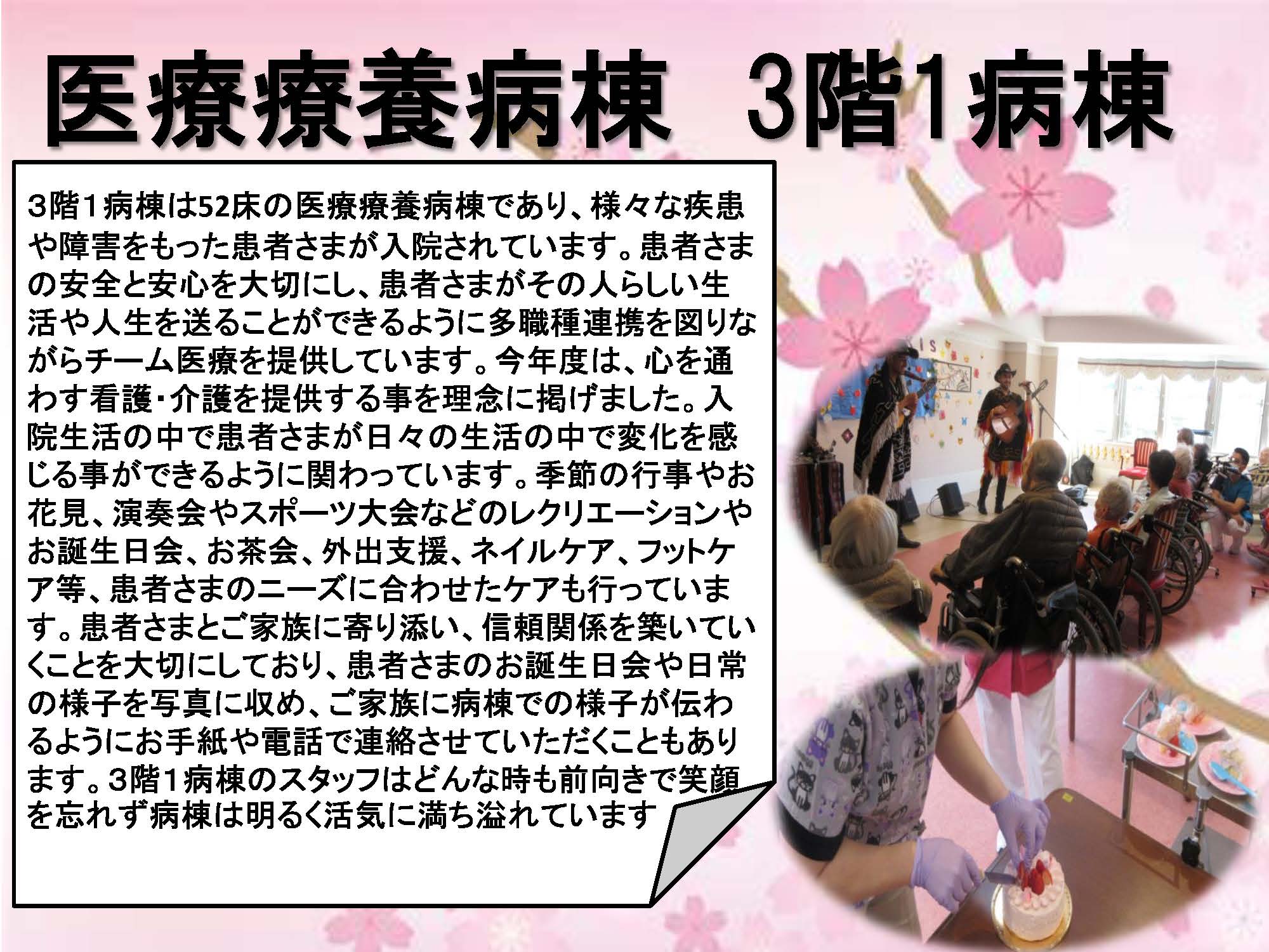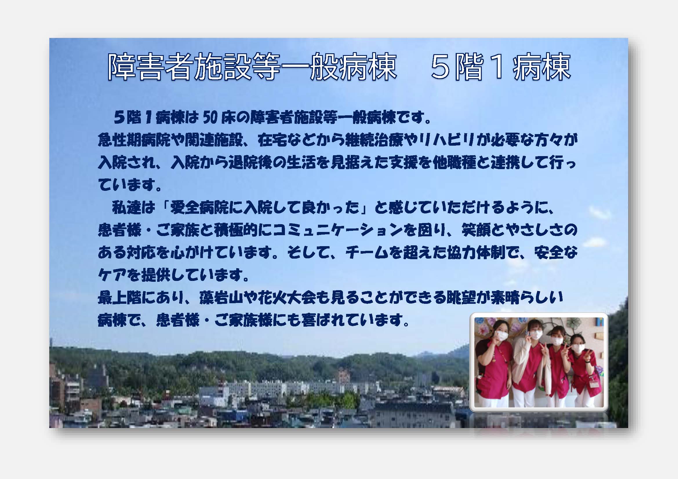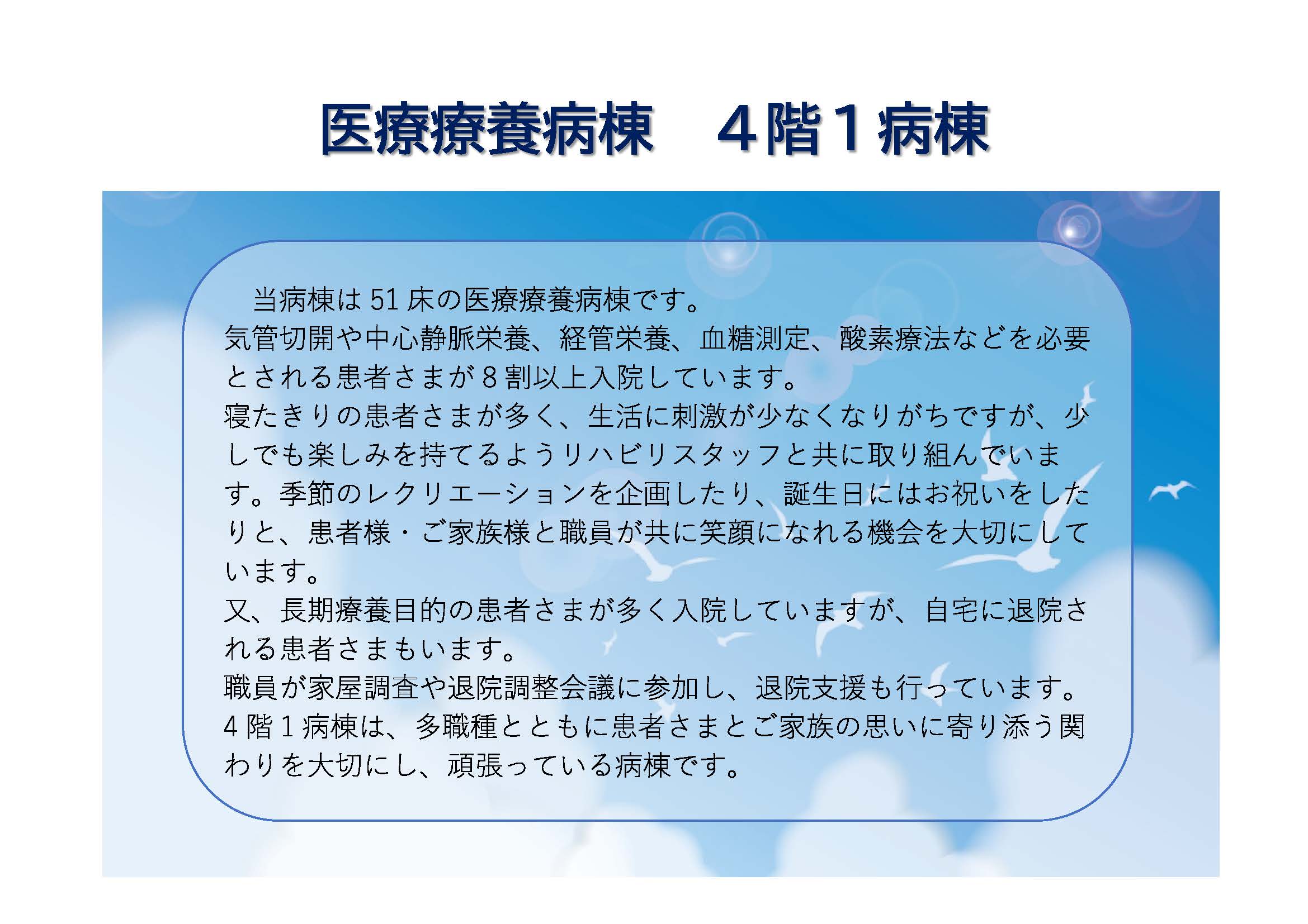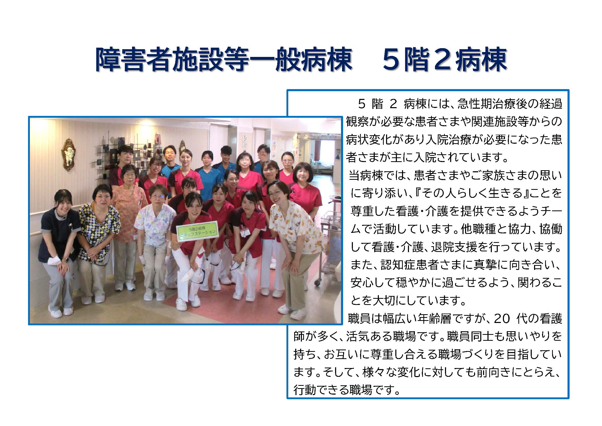 部署紹介 障害者施設等一般病棟 1階3病棟 障害者施設等一般病棟 2階2病棟 障害者施設等一般病棟 4階2病棟 障害者施設等一般病棟 5階1病棟 障害者施設等一般病棟 5階2病棟 医療療養病棟 3階1病棟 医療療養病棟 3階2病棟 医療療養病棟 4階1病棟 回復期リハビリテーション病棟 2階1病棟 外来 介護医療院 フローレンス2階 介護医療院 フローレンス3階 介護医療院 フローレンス4階 看護部管理室 医療安全管理室