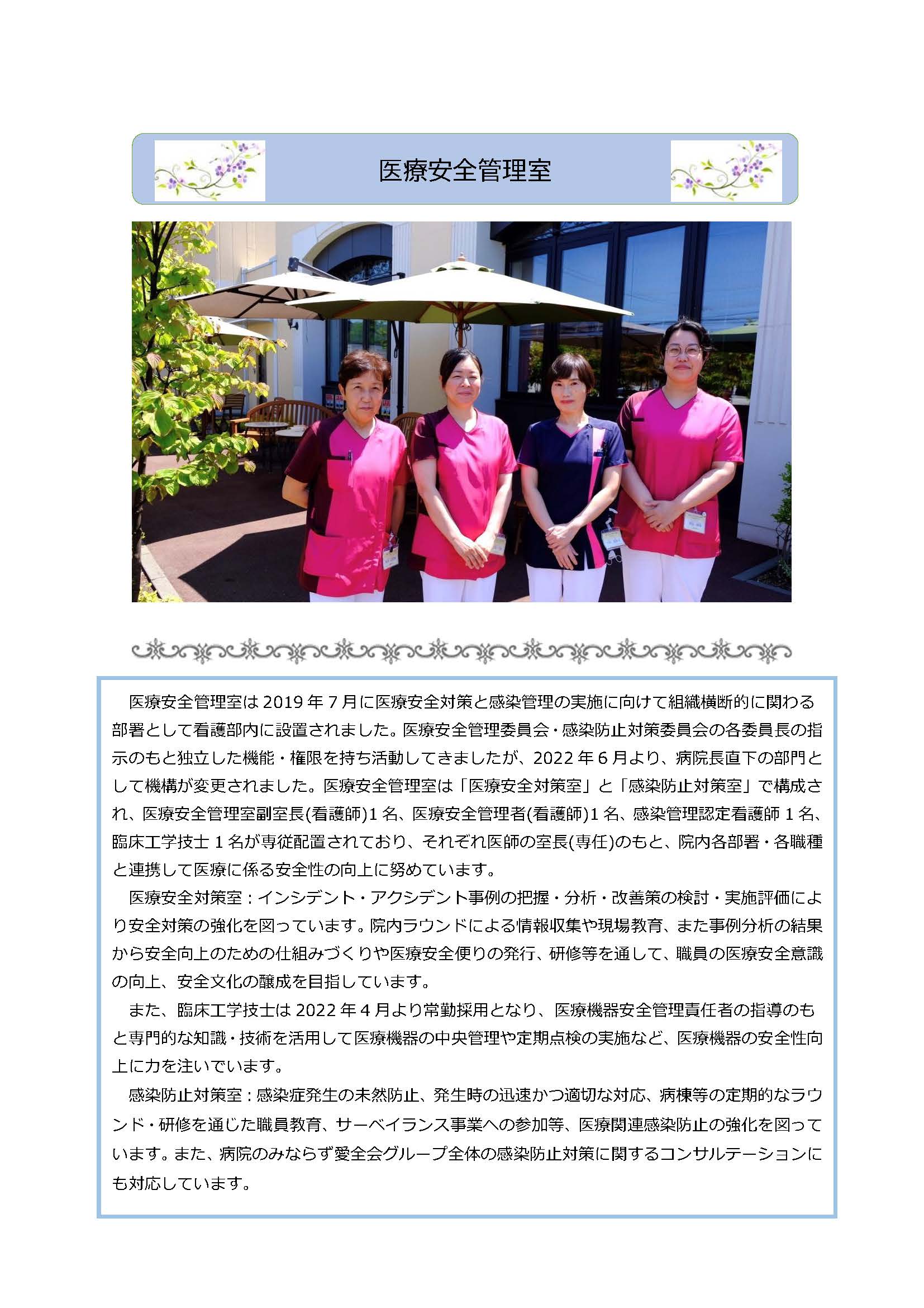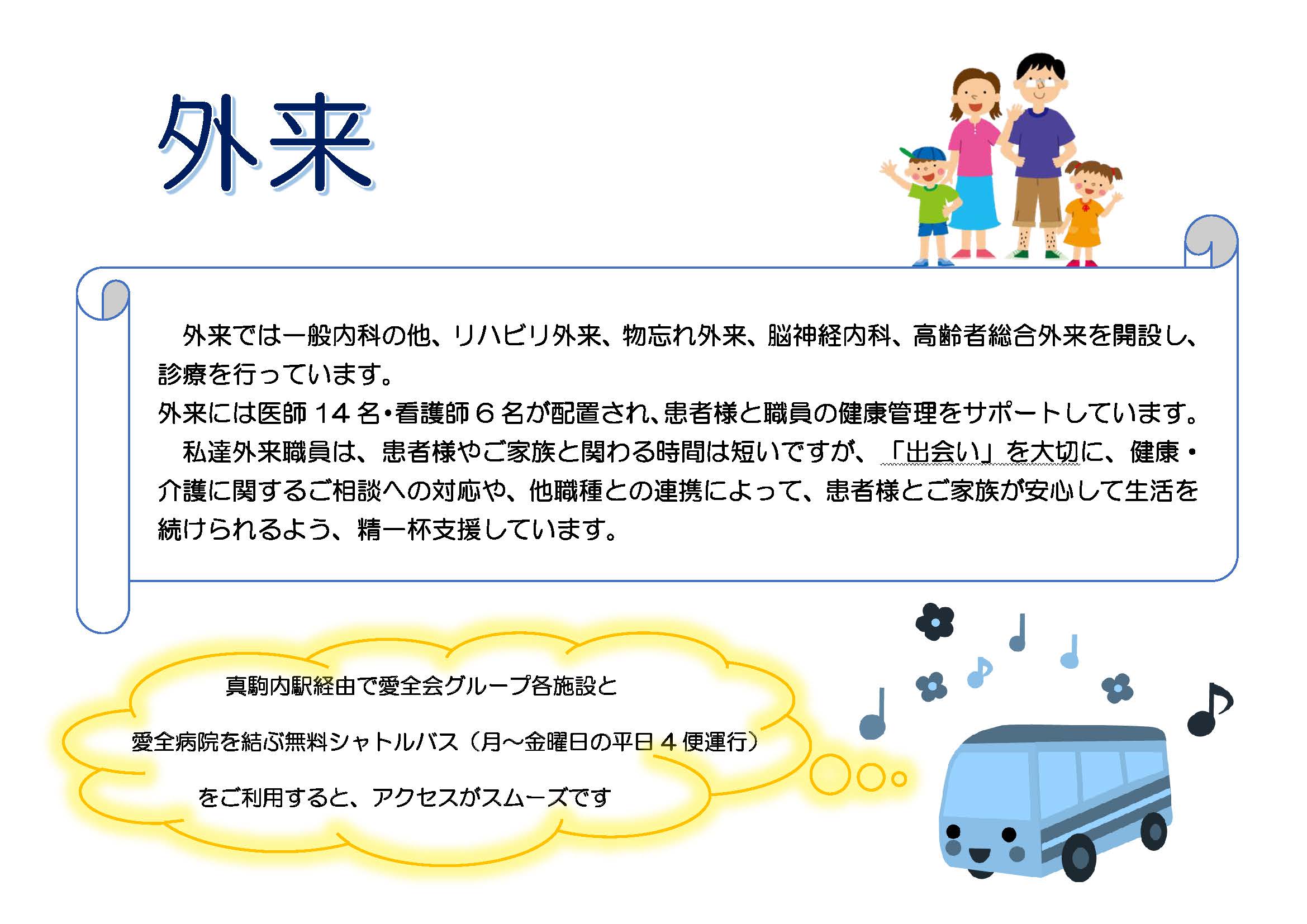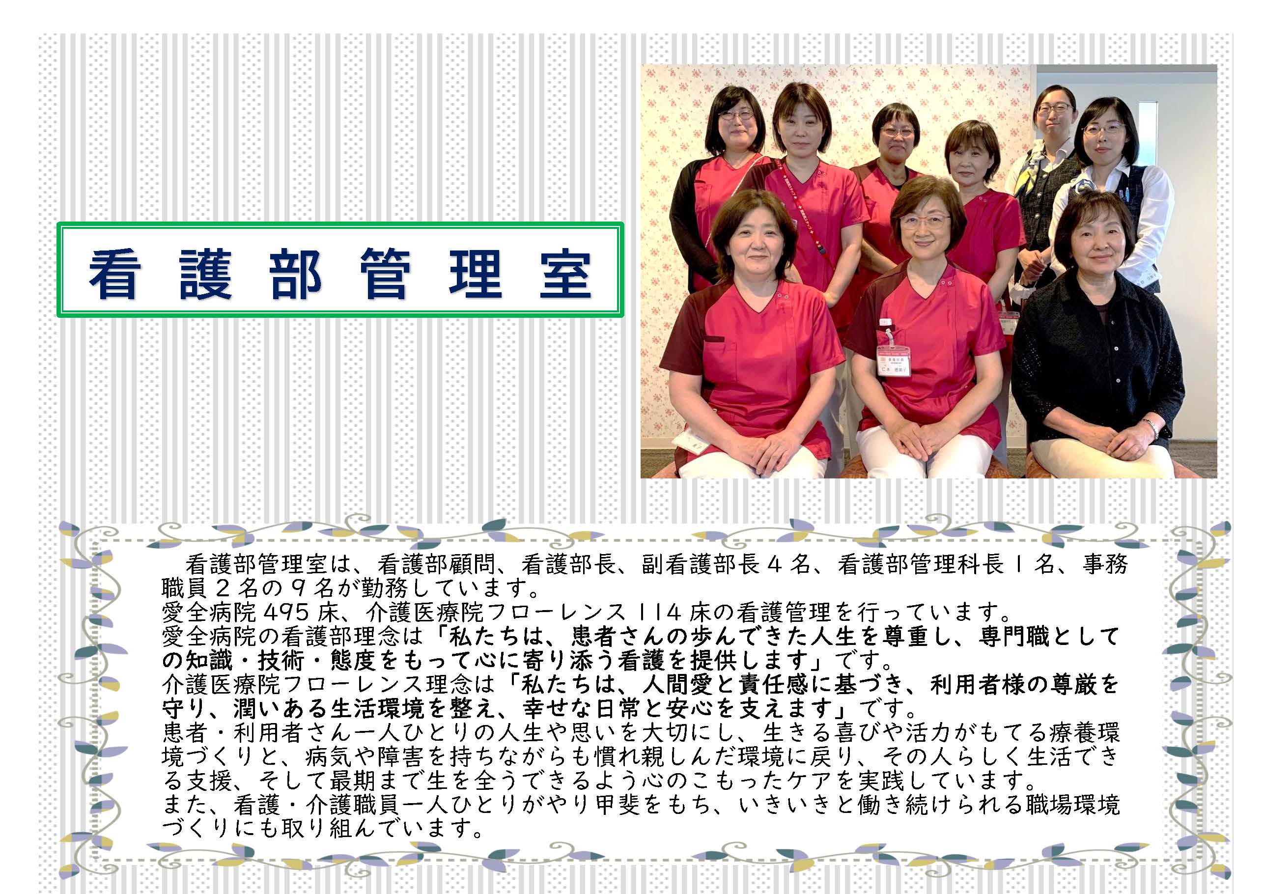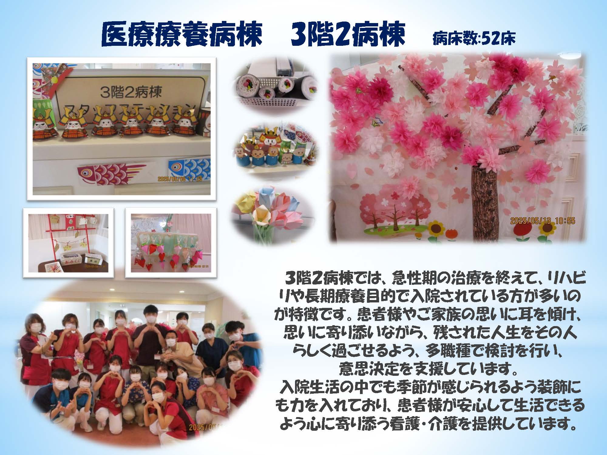 部署紹介 障害者施設等一般病棟 1階3病棟 障害者施設等一般病棟 2階2病棟 障害者施設等一般病棟 4階2病棟 障害者施設等一般病棟 5階1病棟 障害者施設等一般病棟 5階2病棟 医療療養病棟 3階1病棟 医療療養病棟 3階2病棟 医療療養病棟 4階1病棟 回復期リハビリテーション病棟 2階1病棟 外来 介護医療院 フローレンス2階 介護医療院 フローレンス3階 介護医療院 フローレンス4階 看護部管理室 医療安全管理室